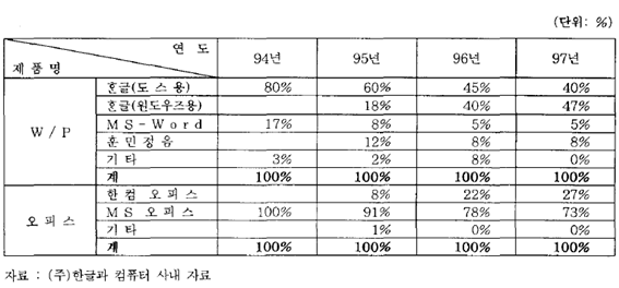 90년대 중반 MS의 윈도우가 IBM PC의 표준적인 운영체제로 자리 잡으면서, 사무용 소프트웨어 시장에서도 MS 오피스가 차지하는 비중이 절대적으로 높아지긴 했지만, <MS 워드>는 <한/글>의 점유율을 쉽게 넘어서지 못했다. 1998년 한글과컴퓨터가 재정위기를 겪고 경영진이 교체되는 사태를 겪은 이후에도, 여전히 한국에서는 워드프로세서라고 하면 <한/글>을 떠올릴 정도로 <한/글>은 막대한 점유율을 자랑하고 있다. 이렇게 자국 워드프로세서가 MS 워드보다 높은 점유율을 누리는 나라는 전세계적으로 매우 드문 것으로 알려져 있다.