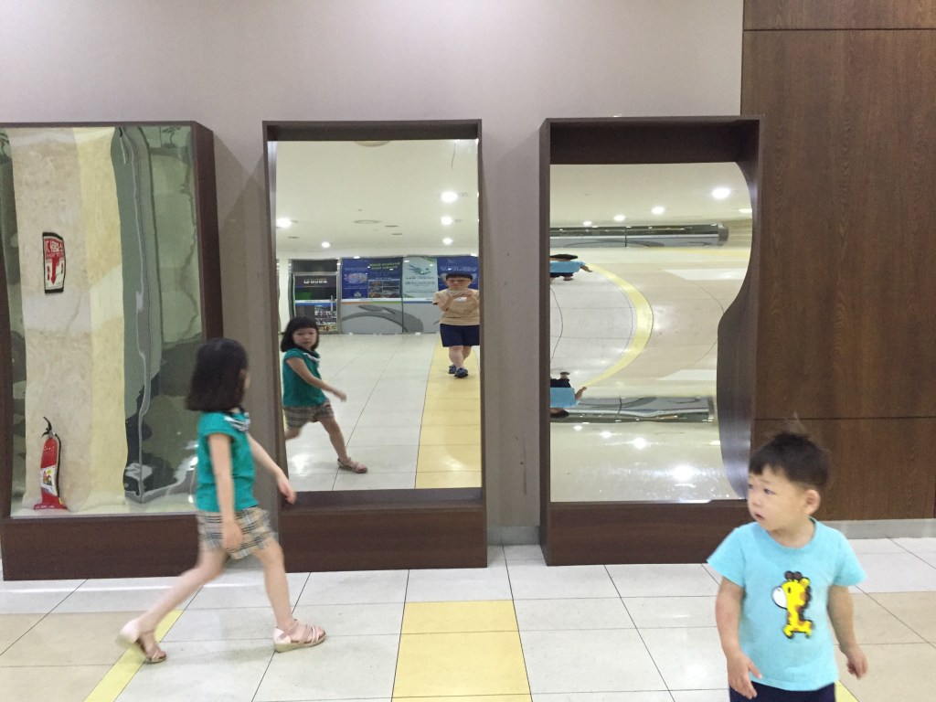 추석 연휴 주말에 웅진플레이도시에 왔다. 사람 많으면 입장하는 데 시간이 오래 걸릴까봐 개장 전에 좀 일찍 왔다. 근데 개장 10분 전까지는 표도 안 팔더라.개장 전 매표소 앞에 갑자기 뽀로로 인형들이 난입했다. 다들 인형들과 사진을 찍는데 하임이랑 하늘이는 가까이 가지 않았다. 하임이는 뽀로로가 없어서였다는 핑계를 댔다. 내가 보기엔 그냥 무서워서였던 것 같은데;; 이제 더이상 물놀이 사진은 없다. 물놀이 중에 사진은 찍지 않는다.킥보드 타는 하임이젠가로 작품 만들고 있는 하임이.자신의 작품과 함께