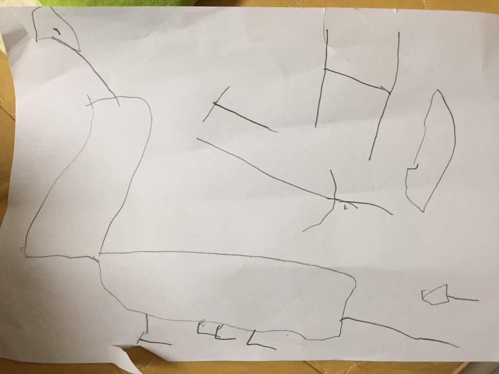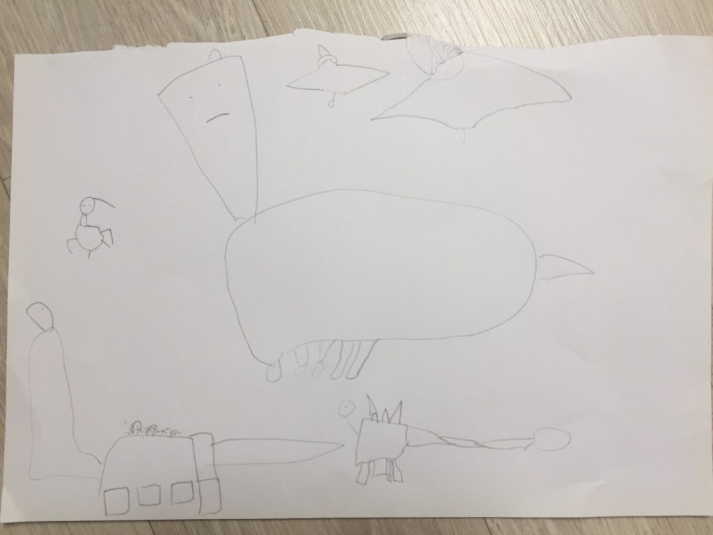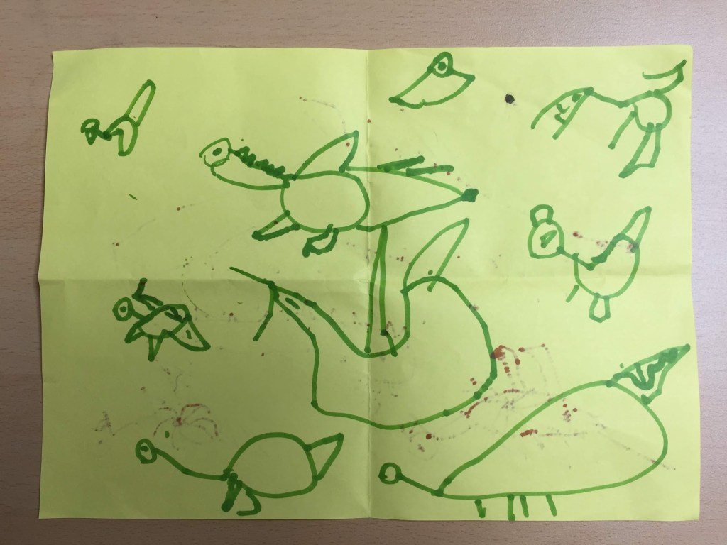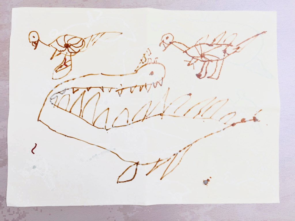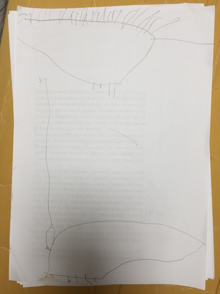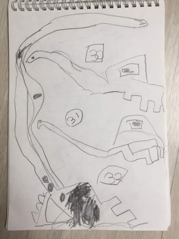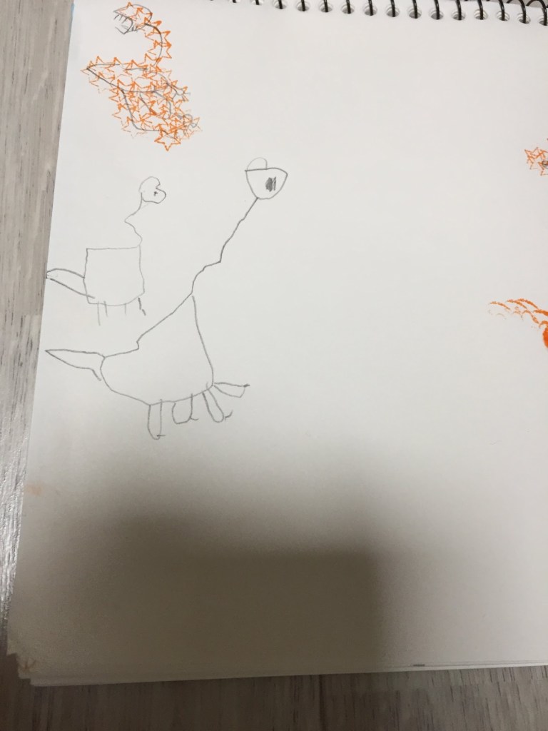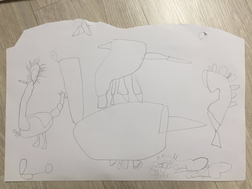 2017년, 5살 하늘이는 아예 그림을 잘 안 그렸다. 5살 시절 하임이는 동그라미 속에 눈코입을 찍어서 사람 얼굴을 그렸었던 것에 비해, 하늘이는 그림에 아무런 관심이 없었다. 그러던 하늘이가 어느 날인가 공룡을 따라 그리기 시작했다.