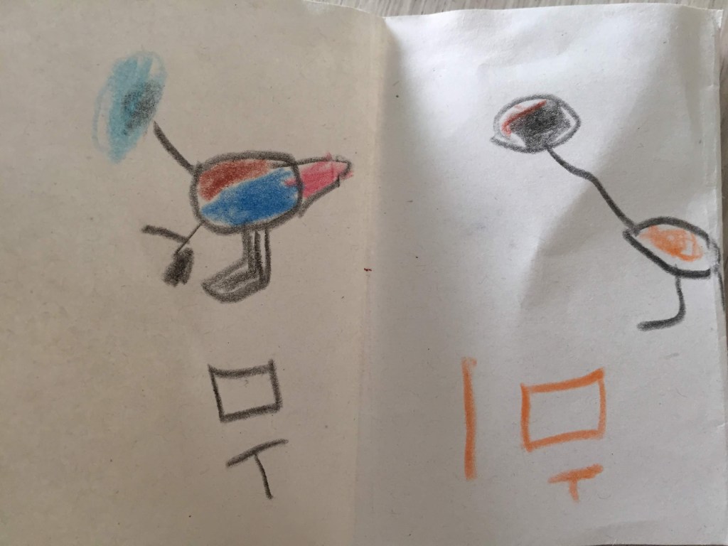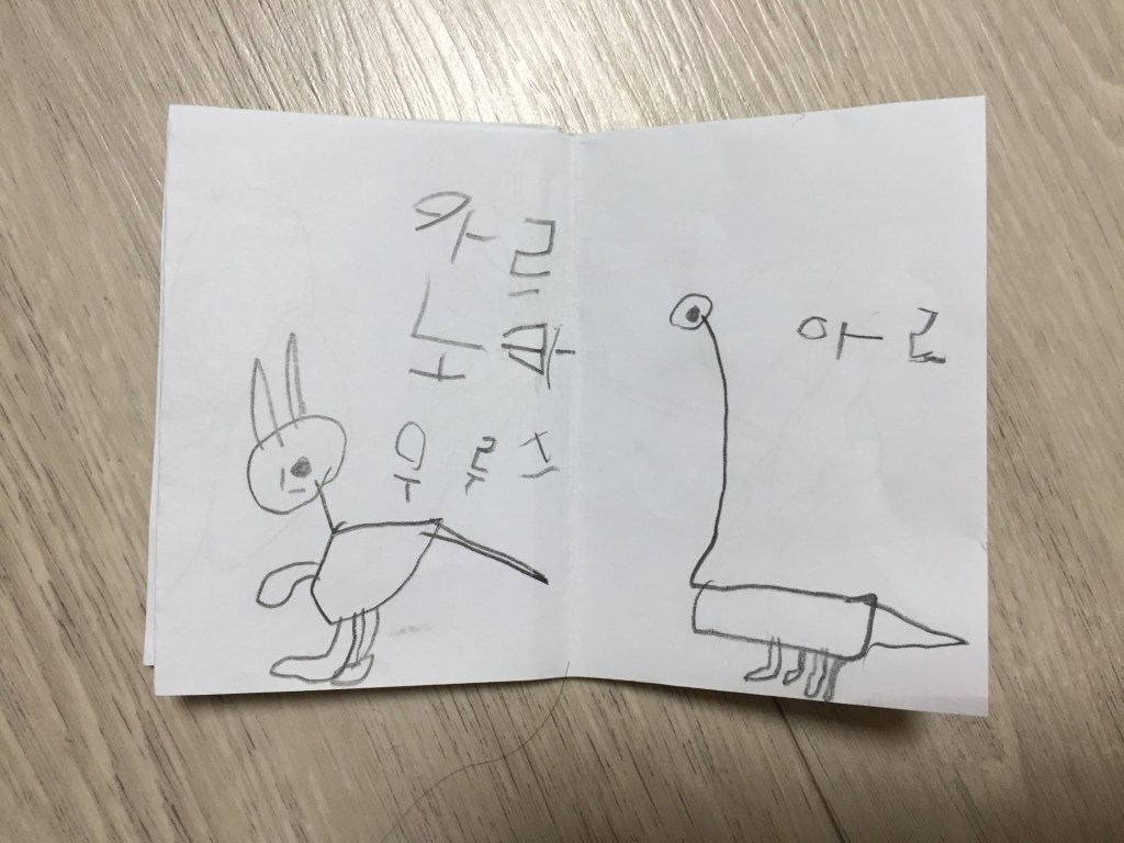 이제 하늘이는 종이를 접어 공룡책을 만들기도 했다. 이제 하늘이는 그림에 공룡의 이름을 적기 시작했다.